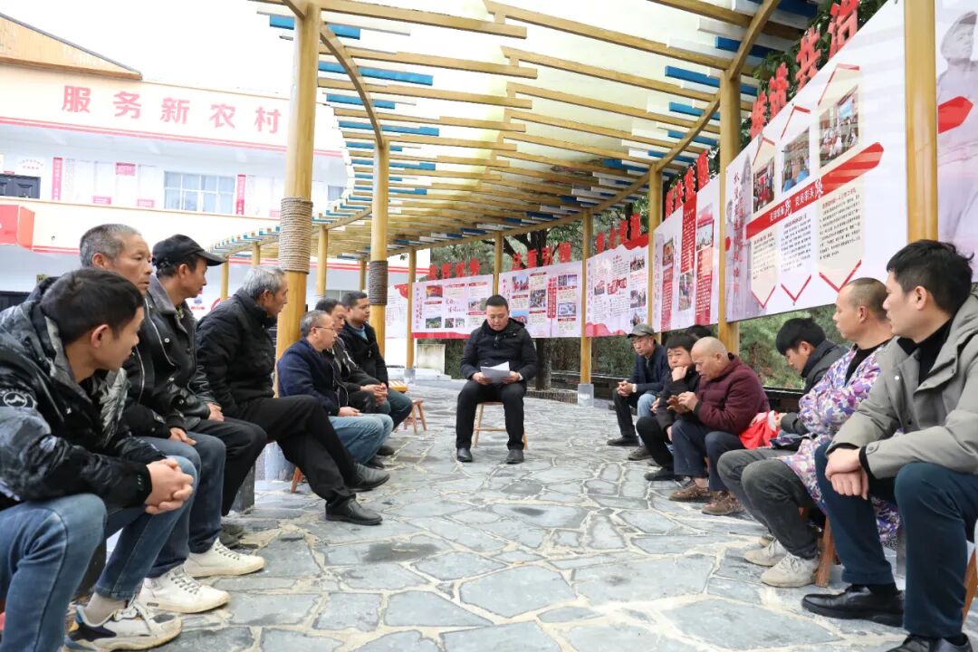 全国道德模范提名奖获得者郑培坤在塔山村文化长廊向村民宣讲全国两会精神。(万再祥 摄)